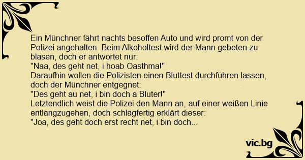 Ein Münchner fährt nachts besoffen Auto und wird promt von der Polizei angehalten. Beim Alkoholtest wird der Mann gebeten zu blasen, doch er antwortet nur: