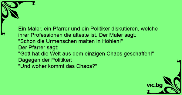 Ein Arzt, ein Architekt und ein Informatiker diskutieren darüber, wer von den dreien den ältesten Beruf habe. Der Arzt: "Ganz am Anfang schnitt Gott Adam eine Rippe heraus und schuf Eva. Das war ja...