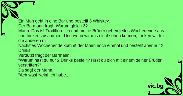 Ein Man geht in eine Bar und bestellt 3 Whiskey.
