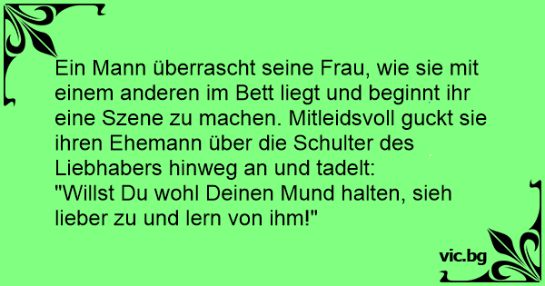 Ein Mann überrascht seine Frau, wie sie mit einem anderen im Bett liegt und beginnt ihr eine Szene zu machen. Mitleidsvoll guckt sie ihren Ehemann über die Schulter des Liebhabers hinweg an und tadelt: