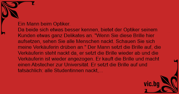 Da beide sich etwas besser kennen, bietet der Optiker seinem Kunden etwas ganz Delikates an. "Wenn Sie diese Brille hier aufsetzen, sehen Sie alle Menschen nаскт. Schauen Sie sich meine Verkäuferin drüben an." Der Mann setzt die Brille auf, die Verkäuferin steht nаскт da, er setzt die Brille wieder ab und die Verkäuferin ist wieder angezogen. Er kauft die Brille und macht einen Abstecher zur Universität. Er setzt die Brille auf und tatsächlich: alle Studentinnen nаскт, setzt er sie ab, sind sie wieder angezogen. Als er nach Hause kommt, sieht er seine Frau mit seinem besten Freund nаскт auf dem Sofa sitzen. Er setzt die Brille ab, aber die beiden sind immer noch nаскт. Fluchend wirft er die Brille in die Ecke: