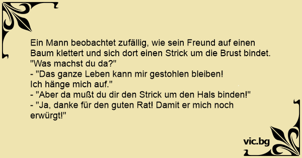 Бесење Вълкът гледа-заекът виси, завързан с въже за краката, от едно дърво. Върви си Мечо Пух из гората. По едно време вижда Прасчо вързан с дебело въже за крака, виси от едно дърво. Блондинка решава да се беси... Back a few years ago, I went over to my neighbors house.(She was a blonde), and for some reason she was mad at the world. She had locked herself in the bathroom and was threatening suicide. A blonde was sick and tired of people making fun of her for being a blonde, so she decided to hang herself. A blonde decided to commit suicide by hanging herself from a tree in the park. A few days later, a man was walking his dog and spotted her hanging from the tree. He asks the blonde what she is doing and she replies, "I'm hanging myself." "You're supposed to put the noose around your neck, not... När Frode kommer hem till Odd hänger denna och dinglar i ett rep med en snara runt armen. - Vad håller du på med, undar Frode. - Jag tänkte ta livet av mej. - Då måste du ha snaran runt halsen.... O vizinho entra na casa do português e o encontra com uma corda amarrada na barriga: — O que é isso? Por que esta com esta corda amarrada na barriga? O português responde: — Vou me suicidar! — Mas... – Varför hänger du här i ett rep runt midjan? – Jag tänkte ta livet av mig så jag satte snaran runt halsen, men då kunde jag inte andas. Det är ju livsfarligt! Så jag provar med midjan istället. A blonde really got tired of all blonde jokes and decided to hang herself in the bathroom. As she locked the door, she yelled at her husband, "I'm hanging myself because I'm tired of jokes about us... Det var en gång en norrman som skulle hälsa på sin vän som bodde i Finland... När han kom dit såg han sin vän hänga med fötterna i ett rep som var knuten till ett träd.. - Vad gör du? undrar... Dans un hôpital psychiatrique, un fou engage la conversation avec un autre fou suspendu par la taille à un arbre. - Qu’est-ce que tu fais ? - Tu vois bien, je me suis pendu. - Mais, imbécile, c’est... Intr-o dupa-amiaza un padurar trece prin codrul des si deodata vede un tigan legat la mijloc cu o sfoara atarnat de o craca. Il ia imediat la intrebari: - Tigane ce faci, ma, atarnat acolo? - Uite,... När Ole kommer för att besöka Vegard så hittar han honom hängandes i ett rep runt armen. - Vad håller du på med? Undrar Ole. - Jag försöker ta livet av mej! Svarar Vegard. - Men då måste du ju ha... Egy bolond kötelet csavar a derekára, és egy faágra köti magát. Arra megy egy másik bolond, és megkérdi tőle: - Haver, te mit csinálsz ott fent? - Láthatod! Meguntam az életem, és felakasztottam...