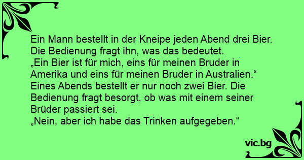 Ein Mann bestellt in der Kneipe jeden Abend drei Bier. Die Bedienung fragt ihn, was das bedeutet. „Ein Bier ist für mich, eins für meinen Bruder in Amerika und eins für meinen Bruder in Australien.“ Eines Abends bestellt er nur noch zwei Bier. Die Bedienung fragt besorgt, ob was mit einem seiner Brüder passiert sei. „Nein, aber ich habe das Trinken aufgegeben.“