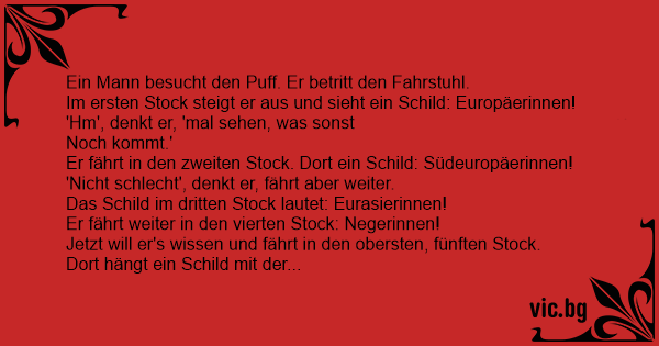 Im ersten Stock steigt er aus und sieht ein Schild: Europäerinnen! 'Hm', denkt er, 'mal sehen, was sonst