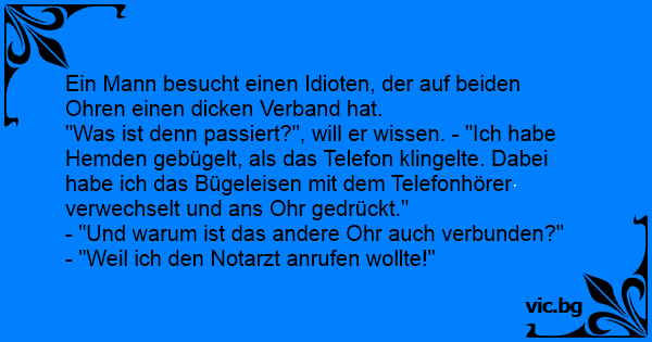 Eine Blondine hat sich beide Ohren verbrannt. "Wie ist denn das passiert?" will der herbeigeeilte Arzt von ihr wissen. "Nun, ich war gerade beim Bügeln, als das Telefon klingelte, und dann habe ich aus Versehen das Bügeleisen ans Ohr gehoben." Daraufhin der Arzt: "Ja, aber wie haben sie...