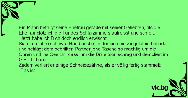 Ein Mann betrügt seine Ehefrau gerade mit seiner Geliebten, als die Ehefrau plötzlich die Tür des Schlafzimmers aufreisst und schreit: