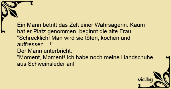 Ein Mann betritt das Zelt einer Wahrsagerin. Kaum hat er Platz genommen, beginnt die alte Frau: "Schrecklich! Man wird sie töten, kochen und auffressen ...!" Der Mann unterbricht: "Moment, Moment! Ich habe noch meine Handschuhe aus Schweinsleder an!"