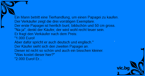 Ein Mann will einen Papagei kaufen. Er sieht sich verschiedene an und entschließt sich zum Kauf eines besonders schönen Exemplares. Der herbeigerufene Verkäufer erklärt, dieser Papagei kostet...