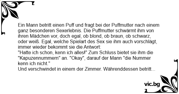 "Hatte ich schon, kenn ich alles!" Zum Schluss bietet sie ihm die "Kapuzennummern" an. "Okay", darauf der Mann "die Nummer kenn ich niсhт."