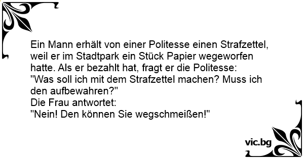 Ein Mann erhält von einer Politesse einen Strafzettel, weil er im Stadtpark ein Stück Papier wegeworfen hatte. Als er bezahlt hat, fragt er die Politesse: