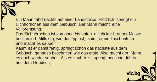 Ein Mann fährt nachts auf einer Landstraße. Plötzlich springt ein Eichhörnchen aus dem Gebüsch. Der Mann macht eine Vollbremsung.