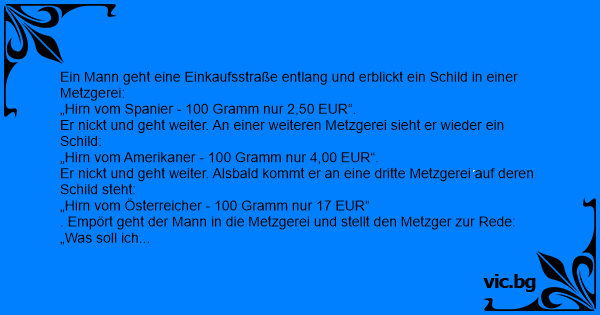 Erwidert der Metzger: „Wissen Sie eigentlich wie viele Österreicher ich totschlagen muss, um 100 Gramm Hirn zusammenzukriegen?“