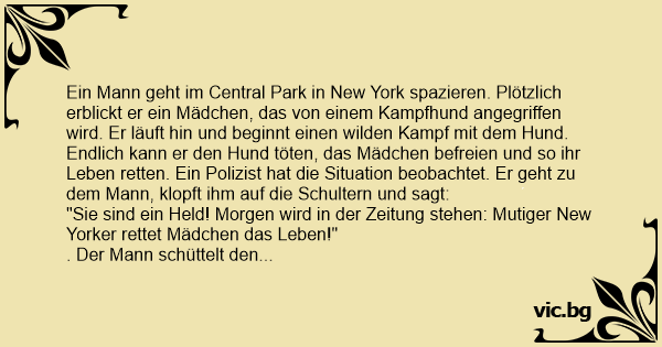 Im Central-Park in New York sieht ein Mann wie ein kleines Kind von einem Kampfhund angegriffen wird.Sofort kommt er dem Kind zur Hilfe, springt dazwischen, kämpft mit dem Hund, tötet ihn und rettet das Kind. Ein zu Hilfe gerufener Polizist ging zu dem mutigen Mann, klopfte ihn anerkennend auf...