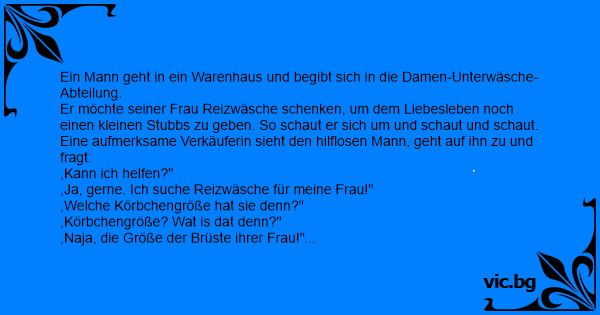 Er möchte seiner Frau Reizwäsche schenken, um dem Liebesleben noch einen kleinen Stubbs zu geben. So schaut er sich um und schaut und schaut.