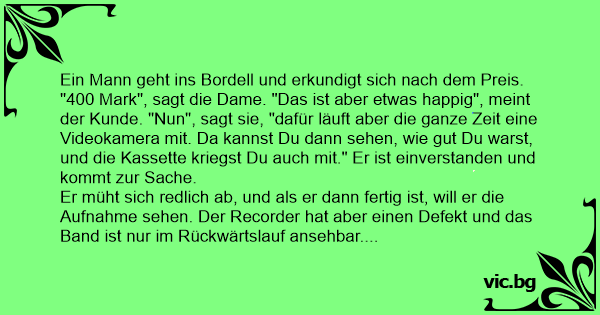 "400 Mark", sagt die Dame. "Das ist aber etwas happig", meint der Kunde. "Nun", sagt sie, "dafür läuft aber die ganze Zeit eine Videokamera mit. Da kannst Du dann sehen, wie gut Du warst, und die Kassette kriegst Du auch mit." Er ist einverstanden und kommt zur Sache.