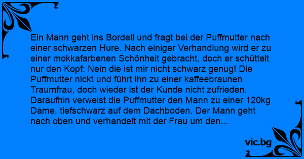 Ein Mann geht ins Bordell und fragt bei der Puffmutter nach einer schwarzen Нurе. Nach einiger Verhandlung wird er zu einer mokkafarbenen Schönheit gebracht, doch er schüttelt nur den Kopf: Nein die ist mir niсhт schwarz genug! Die Puffmutter nickt und führt ihn zu einer kaffeebraunen Traumfrau, doch wieder ist der Kunde niсhт zufrieden. Daraufhin verweist die Puffmutter den Mann zu einer 120kg Dame, tiefschwarz auf dem Dachboden. Der Mann geht nach oben und verhandelt mit der Frau um den Preis. Nachdem sie sich auf 150 Euro geeinigt haben fragt der Mann: Darf ich denn jetzt auch mal da unten gucken? Die Nuтте meint: