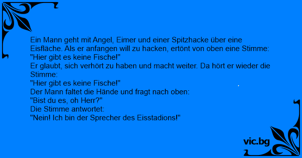 Ein Angler geht aufs Eis, um zu Angeln. Mit einer Spitzhacke will er ein Loch in das Eis schlagen. Nach dem ersten Schlag hört er eine Stimme: „Hier gibt es keinen Fisch!“ Er schaut sich um und...