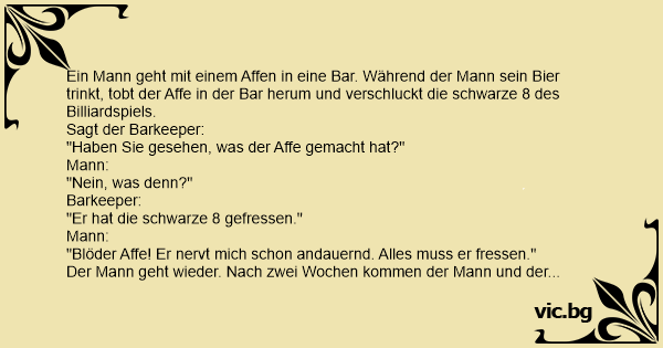 Ein Mann mit einem kleinen Äffchen kommt in eine Bar. Während der Mann gemütlich sein Bier trinkt, springt das Äffchen im ganzen Lokal herum. Es schnappt sich ein paar Erdnüsse auf einem Tisch, dann springt es auf den Billardtisch, greift sich eine Billardkugel und schluckt auch diese hinunter....