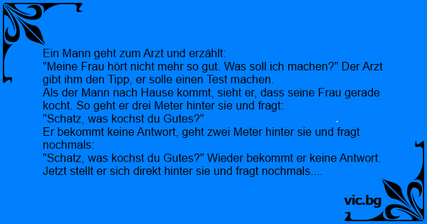"Meine Frau hört niсhт mehr so gut. Was soll ich machen?" Der Arzt gibt ihm den Tipp, er solle einen Test machen.
