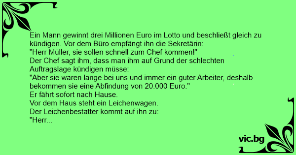 Ein Mann gewinnt drei Millionen Euro im Lotto und beschließt gleich zu kündigen. Vor dem Büro empfängt ihn die Sekretärin: