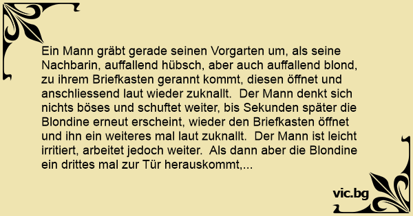 Ein Mann gräbt gerade seinen Vorgarten um, als seine Nachbarin, auffallend hübsch, aber auch auffallend blond, zu ihrem Briefkasten gerannt kommt, diesen öffnet und anschliessend laut wieder zuknallt. Der Mann denkt sich nichts böses und schuftet weiter, bis Sekunden später die Blondine erneut erscheint, wieder den Briefkasten öffnet und ihn ein weiteres mal laut zuknallt. Der Mann ist leicht irritiert, arbeitet jedoch weiter. Als dann aber die Blondine ein drittes mal zur Tür herauskommt, den Briefkasten öffnet und lauter und wütender als je zuvor zuknallt, kann der Nachbar seine Neugierrde nichtmehr weiter zügeln und fragt: