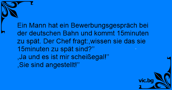 Ein Mann hat ein Bewerbungsgespräch bei der deutschen Bahn und kommt 15minuten zu spät. Der Chef fragt:,wissen sie das sie 15minuten zu spät sind?’’