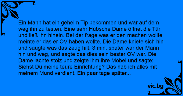 Ein Mann hat ein geheim Tip bekommen und war auf dem weg ihn zu testen. Eine sehr Hübsche Dame öffnet die Tür und ließ ihn hinein. Bei der frage was er den machen wollte meinte er das er OV haben wollte. Die Dame kniete sich hin und saugte was das zeug hilt. 3 min, später war der Mann hin und weg, und sagte das dies sein bester OV war. Die Dame lachte stolz und zeigte ihm ihre Möbel und sagte: Siehst Du meine teure Einrichtung? Das hab ich alles mit meinem Mund verdient. Ein paar tage später besuchte der Mann wieder seine Traumfrau, und diesmal schlug die Dame vor AV zu machen. Der Mann war natürlich sehr froh darüber und ging direkt zur Sache.