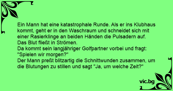 Ein Mann hat eine katastrophale Runde. Als er ins Klubhaus kommt, geht er in den Waschraum und schneidet sich mit einer Rasierklinge an beiden Händen die Pulsadern auf. Das Blut fließt in Strömen.