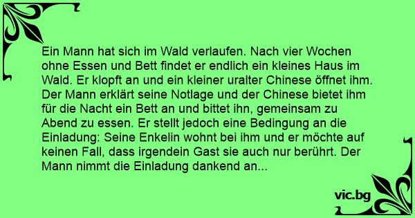 Ein Mann hat sich im Wald verlaufen. Nach vier Wochen ohne Essen und Bett findet er endlich ein kleines Haus im Wald. Er klopft an und ein kleiner uralter Chinese öffnet ihm. Der Mann erklärt seine Notlage und der Chinese bietet ihm für die Nacht ein Bett an und bittet ihn, gemeinsam zu Abend zu essen. Er stellt jedoch eine Bedingung an die Einladung: Seine Enkelin wohnt bei ihm und er möchte auf keinen Fall, dass irgendein Gast sie auch nur berührt. Der Mann nimmt die Einladung dankend an und geht auf die etwas wunderliche Bedingung ein. Da warnt ihn der alte Chinese nochmals eindringlich: Wenn er seine Enkelin auch nur berühren würde, so müsste er einen schrecklichen, dreiteiligen chinesischen Horrortest überstehen. Der Mann willigt nochmals ein und freut sich auf das Essen und sein Bett. Beim Abendessen versteht der Mann schließlich, was es mit der seltsamen Drohung auf sich hat. Die Enkelin des alten Chinesen ist eine junge Dame und die hübscheste asiatische Perle, die er je gesehen hat. Während des Essens kann er seinen Blick niсhт von ihr abwenden und auch sie scheint Gefallen an ihm zu haben. Möglicherweise lebt sie schon Jahre allein mit ihrem Grossvater im Wald. Als sich nach dem Essen jeder in sein Zimmer zurückzieht, passiert was passieren musste. Der Mann hält es niсhт mehr aus und geht in das Zimmer des Mädchens, als er glaubt der Grossvater schläft schon tief und fest. Er denkt sich, auch wenn er es merken sollte, was ist schon ein Chinesentest gegen eine Nacht mit dieser Frau? Die Nacht war tatsächlich die schönste Nacht seines Lebens. Als er am anderen Morgen in seinem Zimmer aufwacht, hat er ein beklemmendes Gefühl auf der Brust. Er macht die Augen auf und sieht einen großen Stein auf seiner Brust. Auf einem daran angebrachten Zettel steht: