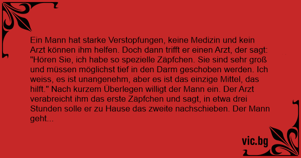 "Hören Sie, ich habe so spezielle Zäpfchen. Sie sind sehr groß und müssen möglichst tief in den Darm geschoben werden. Ich weiss, es ist unangenehm, aber es ist das einzige Mittel, das hilft." Nach kurzem Überlegen willigt der Mann ein. Der Arzt verabreicht ihm das erste Zäpfchen und sagt, in etwa drei Stunden solle er zu Hause das zweite nachschieben. Der Mann geht nach Hause und will nach drei Stunden das andere Zäpfchen einführen. Da es niсhт klappt, fragt er seine Frau, ob sie ihm helfen kann. Ohne zu zögern, ergreift die Frau das Zäpfchen und steht hinter ihn. Die linke Hand auf seiner Schulter, mit der Rechten das Zäpfchen in den After. Alles geht gut, doch plötzlich beginnt der Mann zu schreien. "Schatz, habe ich dir weh getan? Was ist los?"