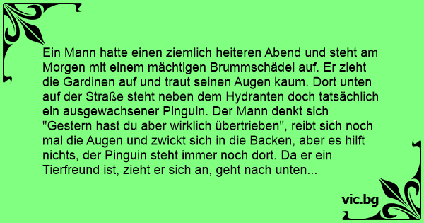 Ein Mann hatte einen ziemlich heiteren Abend und steht am Morgen mit einem mächtigen Brummschädel auf. Er zieht die Gardinen auf und traut seinen Augen kaum. Dort unten auf der Straße steht neben dem Hydranten doch tatsächlich ein ausgewachsener Pinguin. Der Mann denkt sich "Gestern hast du aber wirklich übertrieben", reibt sich noch mal die Augen und zwickt sich in die Backen, aber es hilft nichts, der Pinguin steht immer noch dort. Da er ein Tierfreund ist, zieht er sich an, geht nach unten und nimmt den Pinguin mit aufs Polizeirevier, um zu fragen, was er bloß mit dem Tier machen soll. Der Polizeibeamte dort sagt ihm: