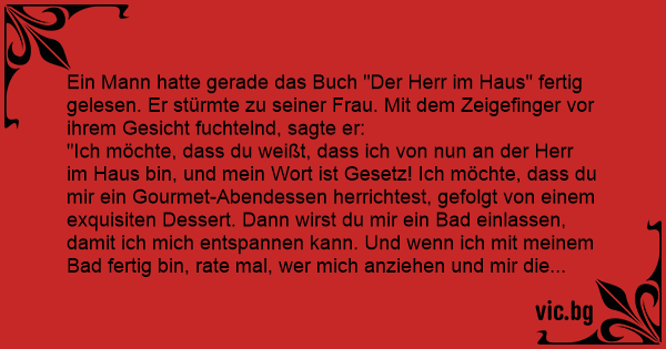 Ein Mann hatte gerade das Buch "Der Herr im Haus" fertig gelesen. Er stürmte zu seiner Frau. Mit dem Zeigefinger vor ihrem Gesicht fuchtelnd, sagte er: