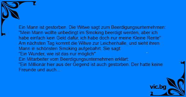 Am nächsten Tag kommt die Witwe zur Leichenhalle, und sieht ihren Mann in schönsten Smoking aufgebahrt. Sie sagt: