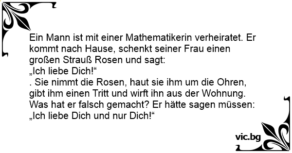 Ein Mann ist mit einer Mathematikerin verheiratet. Er kommt nach Hause, schenkt seiner Frau einen großen Strauß Rosen und sagt: