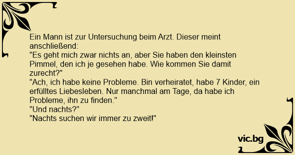 "Ach, ich habe keine Probleme. Bin verheiratet, habe 7 Kinder, ein erfülltes Liebesleben. Nur manchmal am Tage, da habe ich Probleme, ihn zu finden."