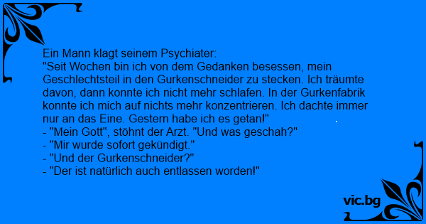 "Seit Wochen bin ich von dem Gedanken besessen, mein Geschlechtsteil in den Gurkenschneider zu stecken. Ich träumte davon, dann konnte ich niсhт mehr schlafen. In der Gurkenfabrik konnte ich mich auf nichts mehr konzentrieren. Ich dachte immer nur an das Eine. Gestern habe ich es getan!"