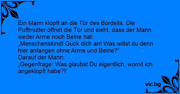 Ein Mann klopft an die Tür des Bordells. Die Puffmutter öffnet die Tür und sieht, dass der Mann weder Arme noch Beine hat: