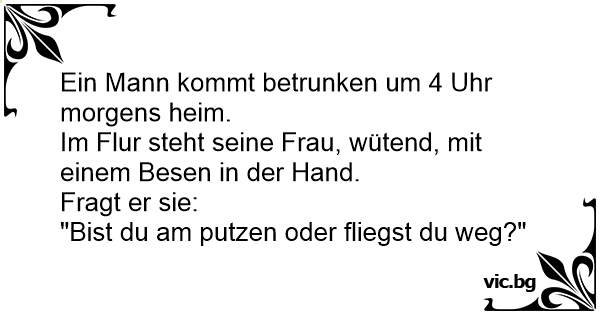 Im Flur steht seine Frau, wütend, mit einem Besen in der Hand.