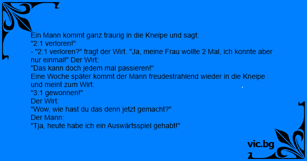 - "2:1 verloren?" fragt der Wirt. "Ja, meine Frau wollte 2 Mal, ich konnte aber nur einmal!" Der Wirt: