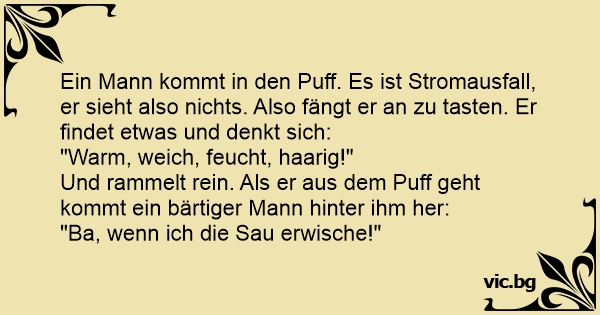 Ein Mann kommt in den Рuff. Es ist Stromausfall, er sieht also nichts. Also fängt er an zu tasten. Er findet etwas und denkt sich: