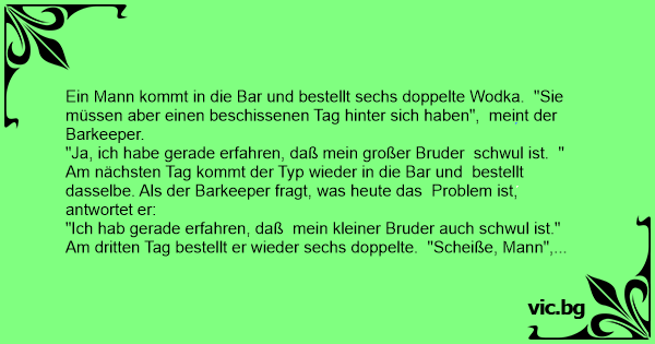 Am dritten Tag bestellt er wieder sechs doppelte. "Sсhеißе, Mann", sagt der Keeper, "steht in Ihrer Familie denn gar niemand auf Frauen?" Meint der Typ: