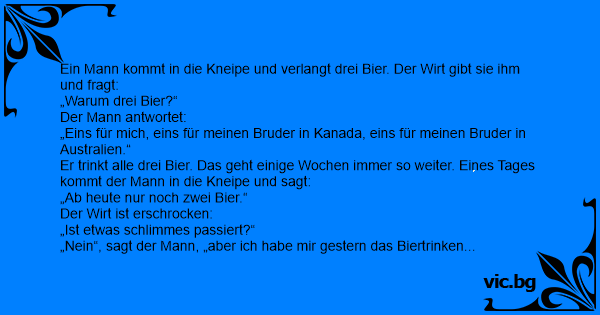 Er trinkt alle drei Bier. Das geht einige Wochen immer so weiter. Eines Tages kommt der Mann in die Kneipe und sagt: