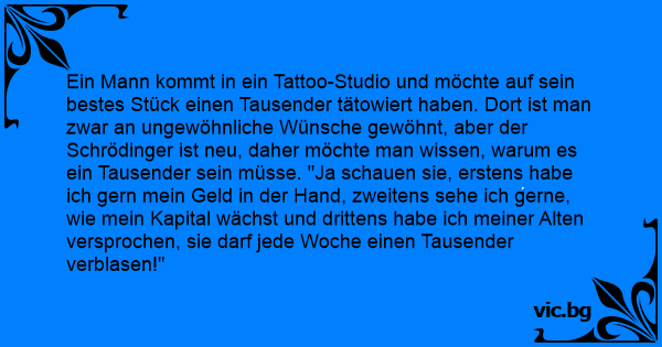 Ein Mann kommt in ein Tattoo-Studio und möchte auf sein bestes Stück einen Tausender tätowiert haben. Dort ist man zwar an ungewöhnliche Wünsche gewöhnt, aber der Schrödinger ist neu, daher möchte man wissen, warum es ein Tausender sein müsse. "Ja schauen sie, erstens habe ich gern mein Geld in der Hand, zweitens sehe ich gerne, wie mein Kapital wächst und drittens habe ich meiner Alten versprochen, sie darf jede Woche einen Tausender verblasen!"