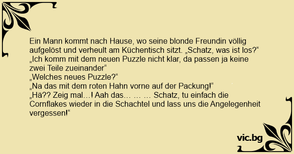 Das schwierige Puzzle Eine Blondine kauft ein Puzzle Puzzle για ξανθιές. Το πάζλ. Preocupadíssima, a loira liga para o celular do namorado: Eine Blondine ruft total verzweifelt Ihren Freund von der Arbeit aus an. Der Mann hebt ab und fragt was Sie denn habe. Sie total fertig, antwortet: "Ich habe mir heute ein Puzzle in der Stadt gekauft, schaffe es aber nicht es zusammenzubauen." "Warum denn", fragt der Freund. "Es hat lauter gleich... Une blonde appelle son mari, en panique: "- Chéri? Vite, rentre à la maison !! - Que se passe t il? - J'ai voulu faire un puzzle toute seule, alors jen ai acheté un, c'était écrit "idéal pour le développement des enfants" dessus. Il y a un joli coq dessiné dessus. Mais même pour les enfants, je... Blondynka dzwoni do swojego chłopaka i mówi: - Kochanie, przyjeżdżaj jak najszybciej, mam naprawdę trudne puzzle do ułożenia. - A co one przedstawiają na pudełku? - Nie wiem, chyba tygrysa. Chłopak decyduje się przyjechać. Kiedy już dojechał załamany mówi: - Kochanie, zrelaksuj się, napijmy się... Le gars reçoit un téléphone de sa blonde " blonde " qui lui dit: - "Je suis découragée, j'ai acheté une boîte de casse-tête et je ne suis pas capable de le faire. " - "C'est quoi le modèle sur la... Raymond reçoit un coup de fil de sa blonde preferee, Gloria qui, visiblement, a quelques problemes : - "J'ai besoin de ton aide, Raymond." - "Qu'est ce qui se passe ?" interroge celui-ci. Gloria :... En blondin ringer sin pojkvän och säger: - Kan du komma över och hjälpa mig? Jag har ett jättepussel. Och jag kan för mitt liv inte komma på hur jag ska göra. Hennes pojkvän frågar: - Vad ska... Een dom blondje belt haar man op. Blondje: “Schat, ik heb een probleem!” Man: “Vertel...” Blondje: “Ik ben vanmiddag aan een puzzel begonnen maar ik kom er niet uit!” Man: “Zo moeilijk zou het... En blondin ringer till sin pojkvän. - Hej, kan du komma hit och hjälpa mej med ett vansinnigt svårt pussel? - Vad föreställer den? Asså pusslet? frågar han. - Typ nån tupp, svarar blondinen. -... A blonde calls her boyfriend and says, "Please come over here and help me. I have a killer jigsaw puzzle, and I can't figure out how to get started." Her boyfriend asks, "What is it supposed to be... "Een blondje belt haar vriend, met de mededeling dat ze een probleem heeft."Wat is er aan de hand?" vraagt hij."Nou, ik heb een legpuzzel gekocht, maar ik vind 'm zo moeilijk.De stukjes passen... Блондинка кличе свого бойфренда: — Допоможи мені скласти паззла, я не знаю як почати... — А що це повинно бути??? — На коробці був намальований гномик. Показує йому шматочки, розсипані на столі.... Mία ξανθιά παίρνει τηλέφωνο κλαίγοντας τον άνδρα της στο γραφείο. - Γιατί κλαις γλυκιά μου; - Να, προσπαθώ να φτιάξω ένα παζλ αλλά... δεν τα καταφέρνω. Όλα τα κομμάτια φαίνονται ίδια. - Τι παζλ; -... A blonde calls her husband at work one day and asks him, "Can you help me when you get home?" "Sure," he replies. "What's the problem?" "Well, I started a really hard puzzle and I can't even find... Superblondinen Lonnie ringer til sin fyr John: Lonnie: “Hej John, kan du ikke komme over og hjælpe mig?” John: “Selvfølgelig Lonnie, hvad er der galt?” Lonnie: “Jeg har lige købt et nyt puslespil,... Eine Blondine ruft ihren Freund bei der Arbeit an. Sie sagt: „ich mache da ein Puzzle aber ich krieg es nicht hin.“ fragt der Freund „Hast du eine Vorlage?“ Sagt sie ja, da ist ein roter Hahn drauf... Eine Blondine ruft bei ihrem Mann, auf der Arbeitsstelle an: "Schatz ich habe im Schrank ein Puzzle gefunden, aber die Teile sehen alle gleich aus. Ich bekomme das nicht zusammengesetzt" Darauf ihr... A szőke nő idegesen felhívja a barátját: - Át tudnál hozzám gyorsan jönni? Nagyon nehéz ez a puzzle, már órák óta kínlódok vele, azt sem tudom honnan kezdjem! - Minek kellene kijönnie belőle? - A... Blondinen lægger puslespil... Mandens telefon ringer. Det er hans kæreste (som er blondine). "Skat, du bliver nødt til at komme hjem og hjælpe mig. Jeg kan simpelthen ikke lægge det her puslespil!"... Blondīne sauc savu draugu: - Palīdzi man salikt puzli, es nezinu, ar ko sākt! - Kam tur jābūt attēlotam? - Uz kastes bija uzzīmēts tīģeris. Blondīne rāda savam draugam pa galdu izkaisīto puzli. Tas... A loira liga para o celular do Fabinho, seu namorado: — Tô com um problema. — O que houve? — Eu comprei um quebra-cabeça, mas é muito difícil! — As peças não se encaixam e eu não consigo encontrar... Een blondje belt haar echtgenoot op zijn mobieltje. Blondje: "Ik heb een probleem!" Echtgenoot: "Zeg het maar" Blondje: "Ik heb net een puzzel gekocht, maar ik kom er niet uit!" Echtgenoot: "Is ie... Une blonde apelle son mari, elle est en pleure : - J'en peut plus, ça fait des heures que je suis bloqué sur ce puzzle. - Ah bon, laisse moi regarder... Ah oui, Alors, je te propose de remettre les... A blonde buys a puzzle and takes it home. After an hour she has none of it together, so she gets frustrated and calls her boyfriend Anant She says " I just bought this puzzle, but i can't find any... A blonde girl calls her boyfriend at work, "Darling, I'm doing this jigsaw puzzle but I just can't figure it out. All the pieces look the same." "And do you have the picture of what it's supposed... Μια ξανθιά, παίρνει τηλέφωνο μια μελαχρινή φίλη της και της λέει: - "Φτιάχνω ένα παζλ, αλλά δε μπορώ να συνδέσω τα κομμάτια, θα έρθεις να με βοηθήσεις; " - "Ναι. Τι εικόνα έχει το 