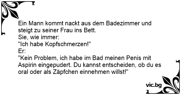 "Kein Problem, ich habe im Bad meinen Реnis mit Aspirin eingepudert. Du kannst entscheiden, ob du es оrаl oder als Zäpfchen einnehmen willst!"