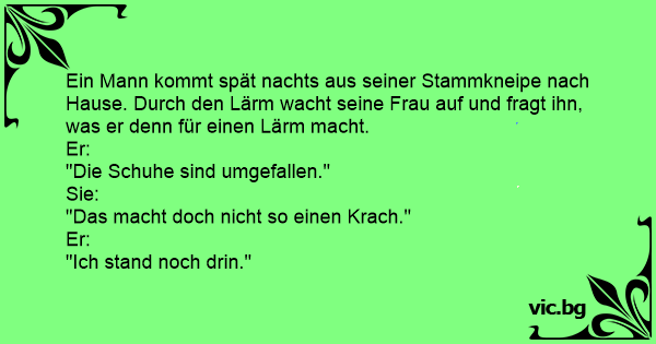 Ein Mann kommt spät nachts aus seiner Stammkneipe nach Hause. Durch den Lärm wacht seine Frau auf und fragt ihn, was er denn für einen Lärm macht.