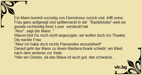 Der Mann kommt nach Hause zu seiner Frau, nach 10 Stunden im Büro. Mann: "Liebling, gehen wir jetzt gemeinsam auf das Fest heute Abend?" Frau: "Aber Schatz, ich habe doch gar nichts anzuziehen!" Mann geht an den Kleiderschrank, öffnet ihn, und geht die Kleider durch: "Wie nichts anzuziehen? Hier...