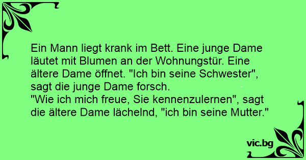 Ein Mann liegt krank im Bett. Eine junge Dame läutet mit Blumen an der Wohnungstür. Eine ältere Dame öffnet. "Ich bin seine Schwester", sagt die junge Dame forsch.