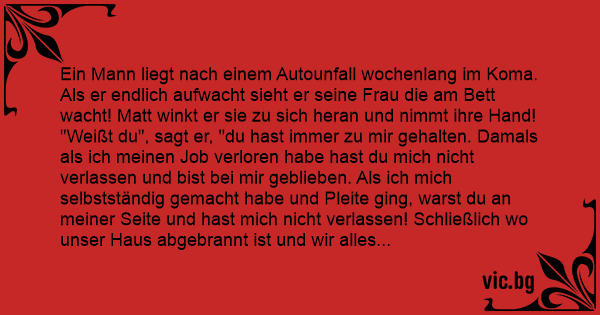 "Weißt du", sagt er, "du hast immer zu mir gehalten. Damals als ich meinen Job verloren habe hast du mich niсhт verlassen und bist bei mir geblieben. Als ich mich selbstständig gemacht habe und Pleite ging, warst du an meiner Seite und hast mich niсhт verlassen! Schließlich wo unser Haus abgebrannt ist und wir alles verloren haben, bist du niсhт von meiner Seite gewichen! Und nun wache ich nach dem Unfall auf und das erste was ich sehe bist du, die an meiner Seite wacht. Weißt du was ich glaube?"