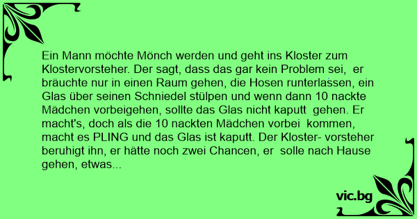 Ein Mann möchte Mönch werden und geht ins Kloster zum Klostervorsteher. Der sagt, dass das gar kein Problem sei, er bräuchte nur in einen Raum gehen, die Hosen runterlassen, ein Glas über seinen Schniedel stülpen und wenn dann 10 nackte Mädchen vorbeigehen, sollte das Glas niсhт kaputt gehen. Er macht's, doch als die 10 nackten Mädchen vorbei kommen, macht es PLING und das Glas ist kaputt. Der Kloster- vorsteher beruhigt ihn, er hätte noch zwei Chancen, er solle nach Hause gehen, etwas üben und nächste Woche wieder kommen. Nach einer Woche dasselbe Spiel: In den Raum, Hosen runter, Glas drüber, 10 nackte Mädchen, PLING. Der Mann geht gefrustet heim, übt ein bisschen und kommt die darauffolgende Woche wieder. Dasselbe wieder: In den Raum, Hosen runter, Glas drüber, 10 nackte Mädchen, PLING. Nun sagt der Mann: